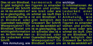 | Typographisches Maßsystem Gliederung der Schrifthöhe Lesbarkeit von Ober- und Unterlängen Schriftgröße Buchstabenabstände Laufweite Laufweite bei Fließtext Punzenbreite und Laufweite Wortabstand (1,2) Zeilenabstand (1,2,3) Zeilenlänge Einzüge Initialen (1,2) Die Satzarten: Blocksatz Mittelachsensatz Linksbündiger Flattersatz Rechtsbündiger Flattersatz Spaltensatz Schusterjungen und Hurenkinder Darstellung von Zahlen |